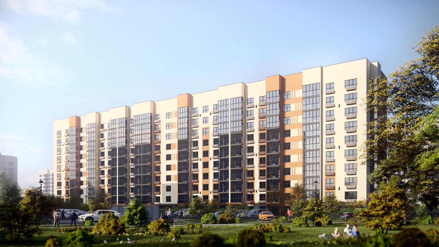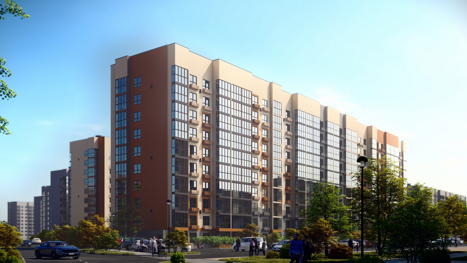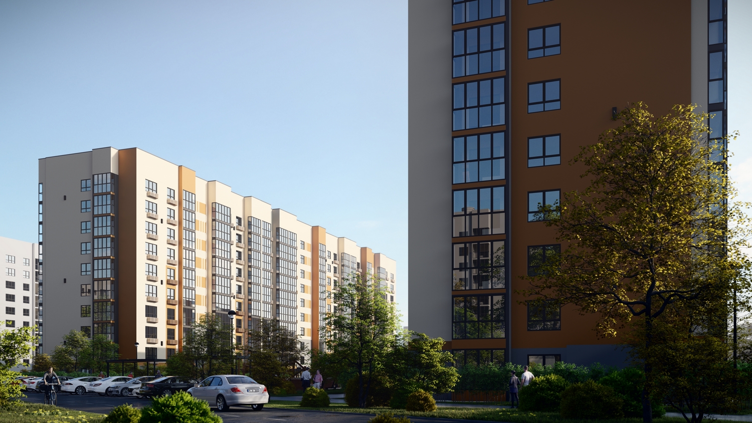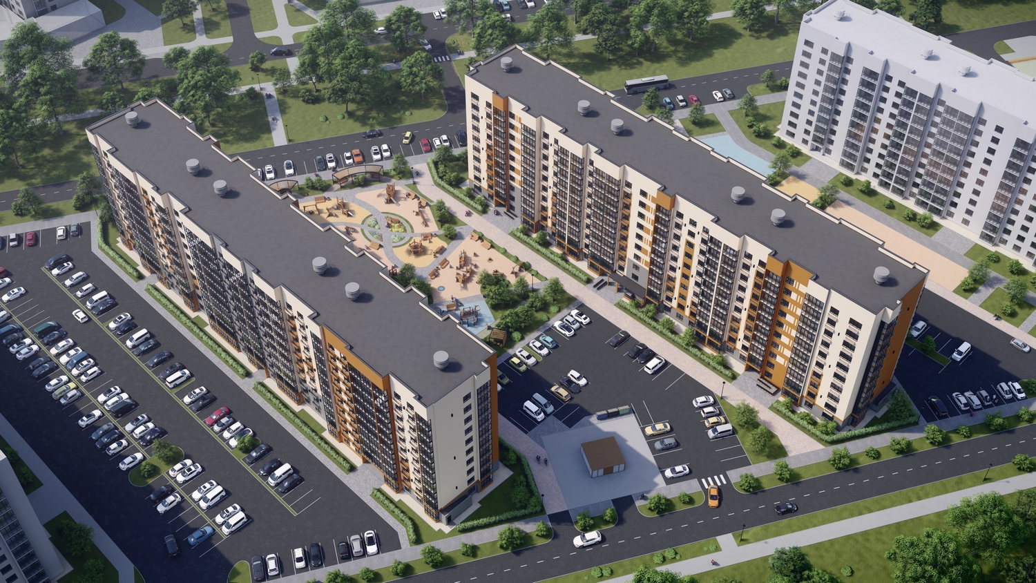 В проекте два панельных дома с фасадами из декоративной штукатурки, высотой 10 этажей с внушительной закрытой от постоянного присутствия транспорта дворовой территорией. Сочетание сдержанной этажности и удаленности зданий друг от друга наполнит квартиры естественным светом и создаст комфортную уединенность.