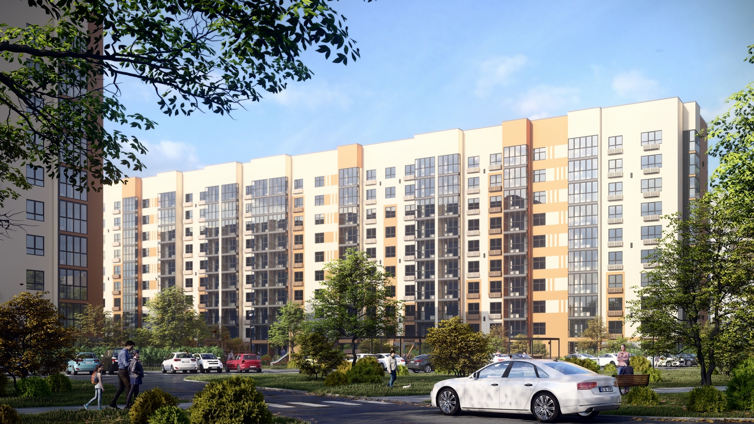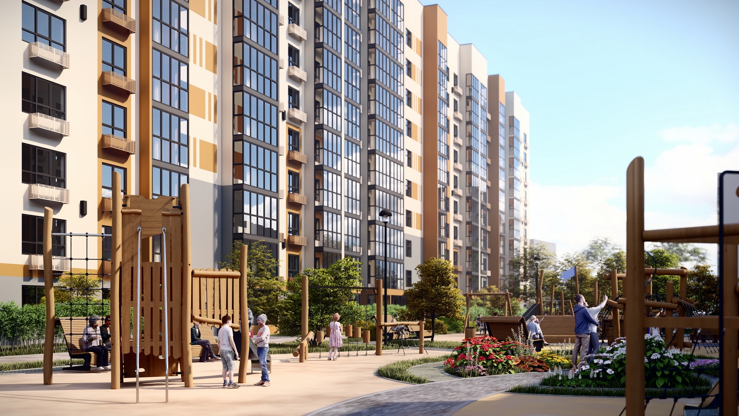 Обширная дворовая территория станет визитной карточкой жилого комплекса благодаря органичному сочетанию разных сценариев времяпровождения для жителей: тематические игровые комплексы, места отдыха для детей и взрослых.